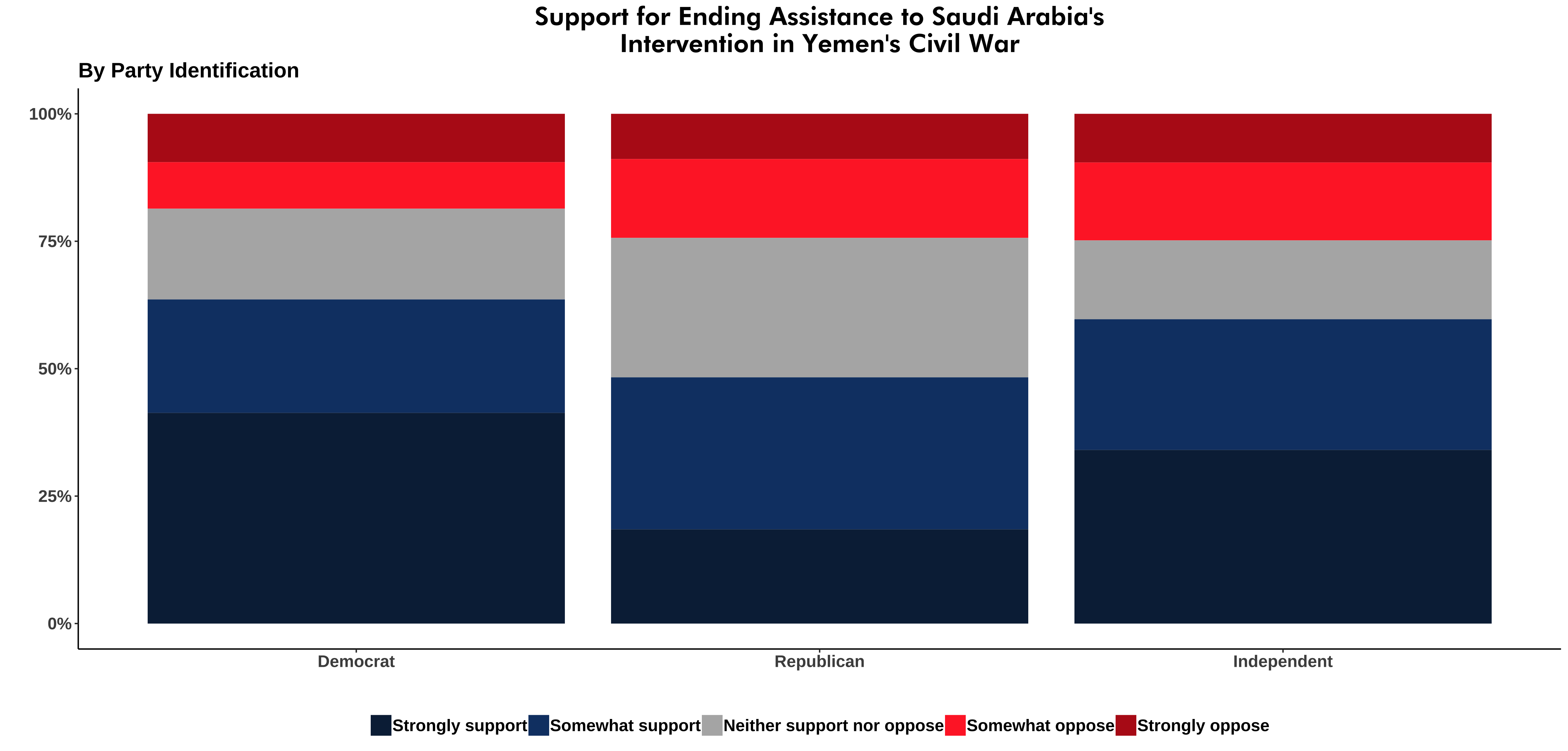 Respondents strongly favored ending America’s role in this conflict. Among all respondents, 51 percent supported ending assistance, compared with just 19 percent who opposed ending assistance. The following plot includes strongly or somewhat support, neither support nor oppose, strongly or somewhat oppose and don’t know among 2018 voters. Among respondents who responded with an opinion (excluding “don’t knows”), 58 percent support ending US support for intervention and 22 percent oppose it.