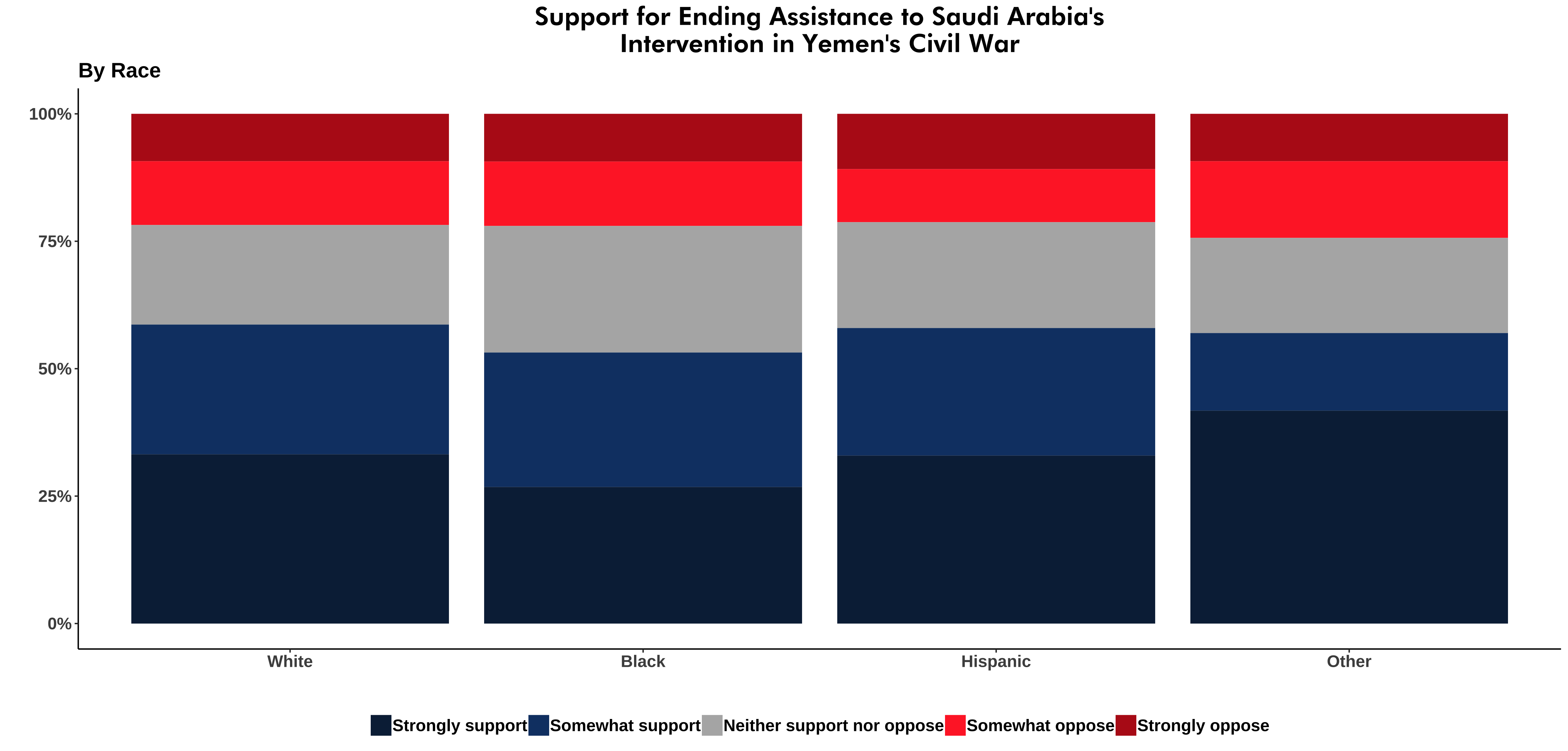 Across the full sample, a majority of voters of color supported ending America’s role in Saudi Arabia’s intervention, including majorities of Black, Latino, and other race respondents, as well as an outright majority of “non-white” respondents. Fully 57 percent of white respondents, 53 percent of Black respondents, 58 percent of Latino respondents, and 57 percent of other-race respondents outright supported ending the intervention. In an era of American foreign policy broadly characterized with wars that begin on popular footing, including America’s interventions in Iraq, Afghanistan, and Syria, this level of opposition to an intervention may be a unique failure of Presidential communication in the modern era.